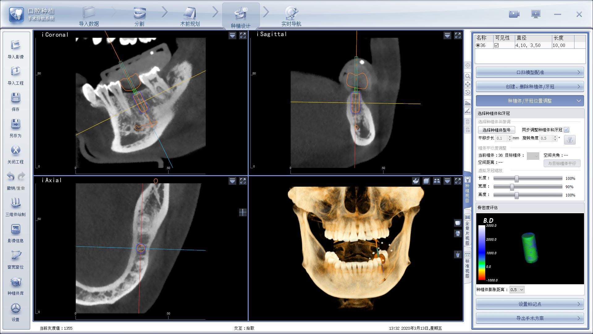 2、 在三位模型的基礎(chǔ)上,進行種植手術(shù)方案的設(shè)計,結(jié)合醫(yī)生的技術(shù)和經(jīng)驗,調(diào)整出最適合的種植手術(shù)方案;